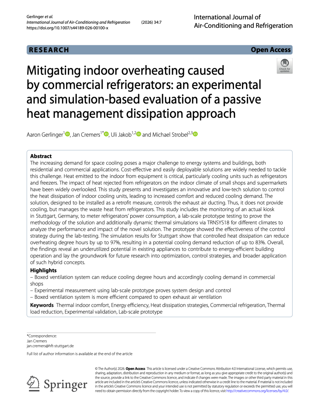 Gerlinger, Aaron; Cremers, Jan; Jakob, Uli; Strobel, Michael: Mitigating indoor overheating caused by commercial refrigerators: an experimental and simulation-based evaluation of a passive heat management dissipation approach. International Journal of Air-Conditioning and Refrigeration. Volume 34, article number 7, (2026). published 22.1.2026